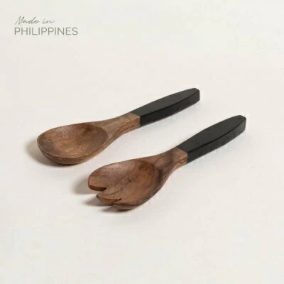 Elegancia natural para tu mesa. Este set de cubiertos para ensalada está tallado a mano en madera maciza, con un diseño que combina la calidez del tono natural con un toque moderno en negro mate en las empuñaduras.